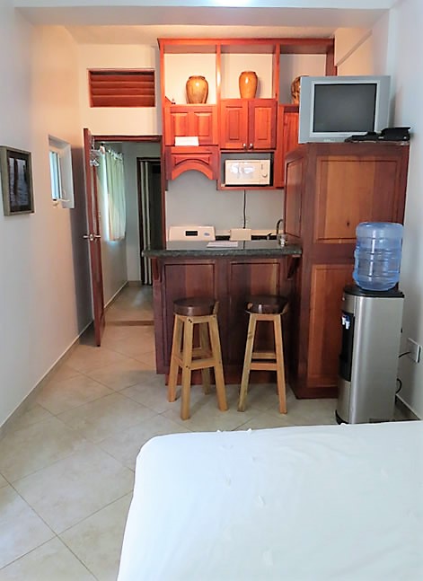 Both studios with their mahogany doors and typical Lenca pottery create a relaxing setting. A 5 ft sliding glass door opens to a small terrace to enjoy the sea breezes.